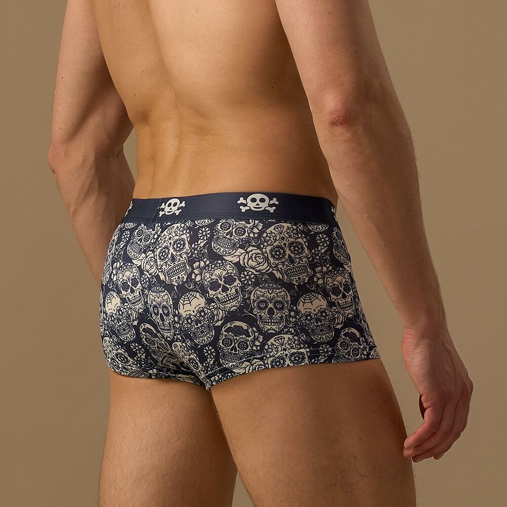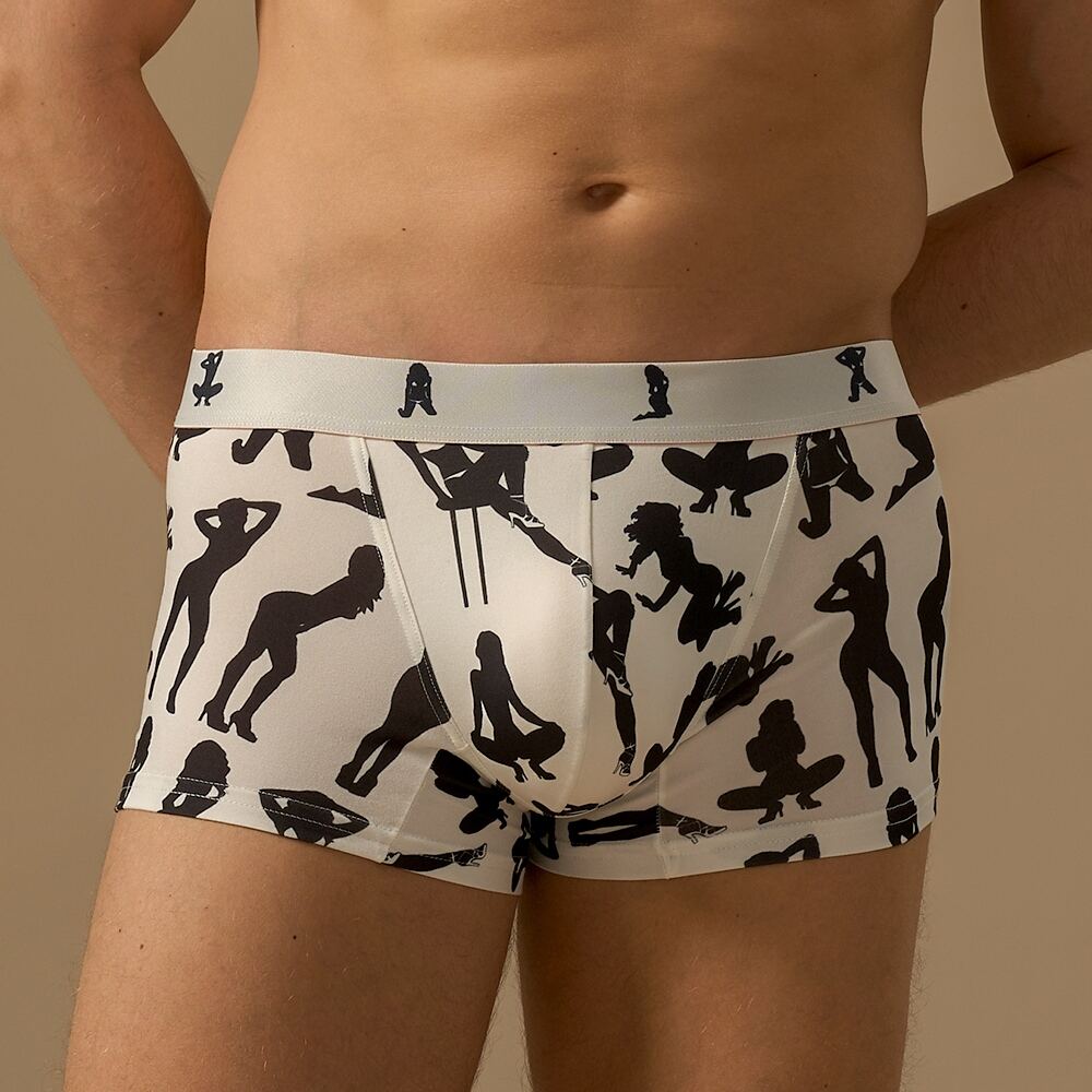 OEM men’s printed boxer trunks with 8-inch rise, contrast waistband and modal gusset. Direct factory supplier for private label brands, influencers, and wholesale underwear collections. |